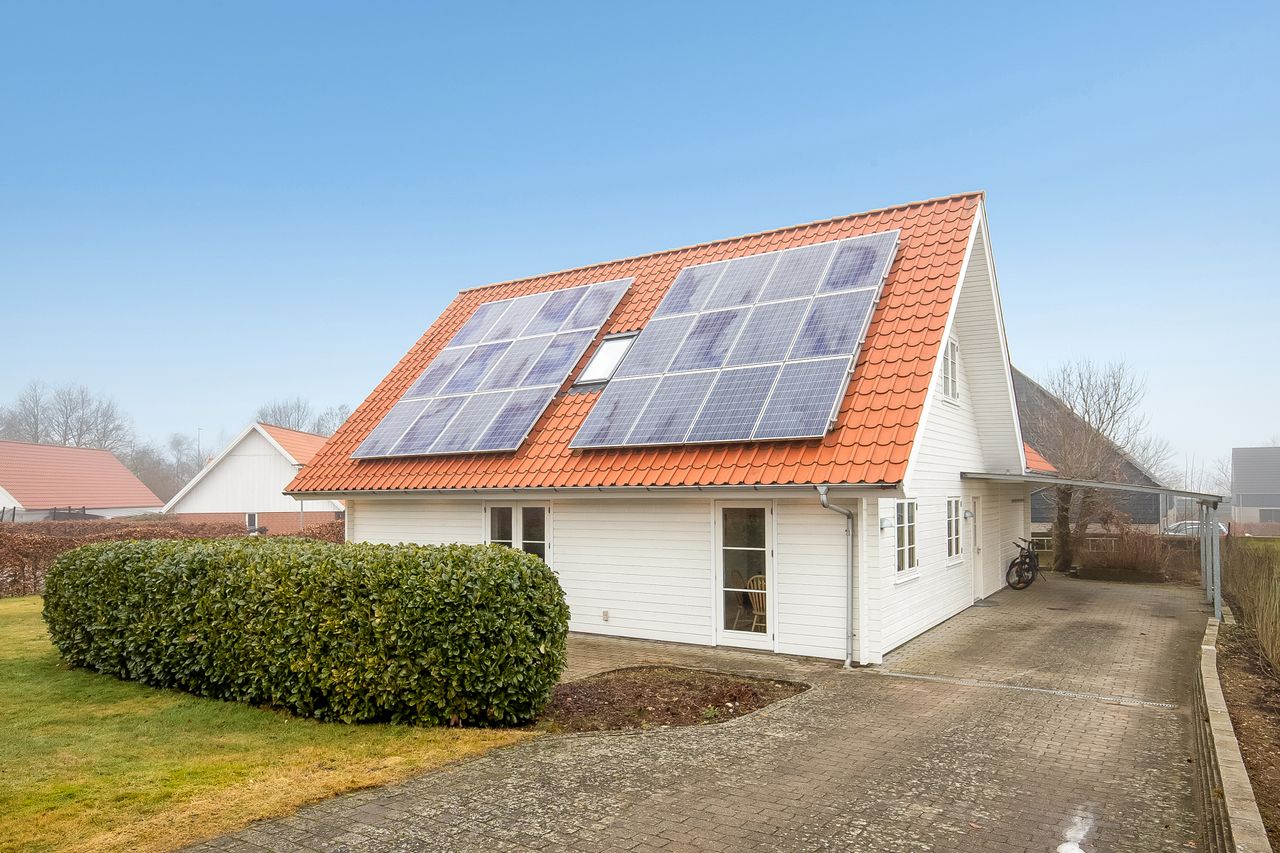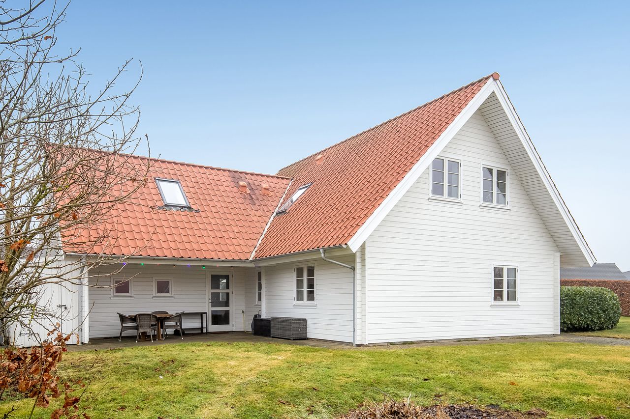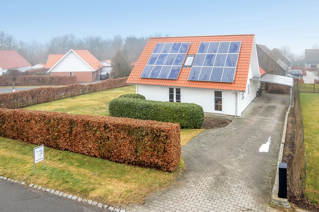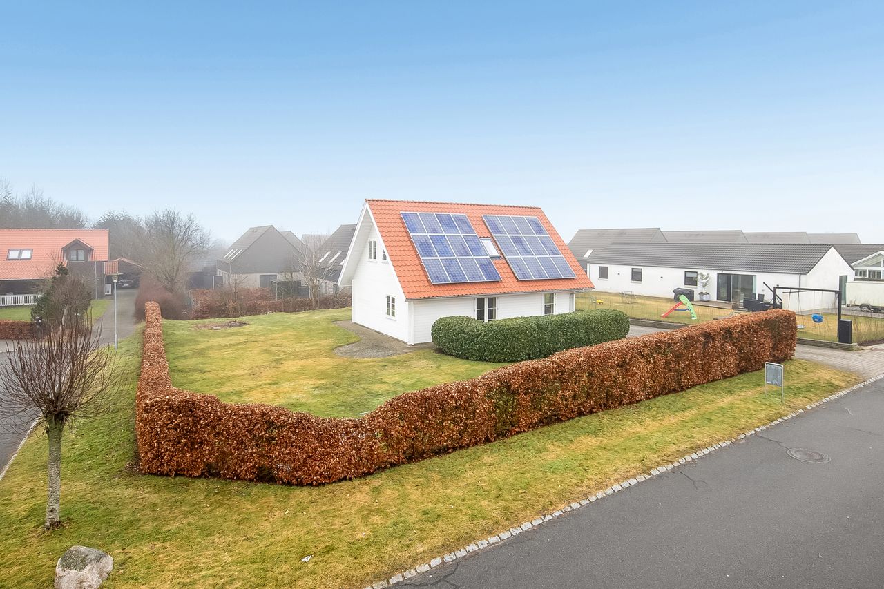 Nyere villa fra 2005 med vellykket tilbygning fra 2012. Opført med facader i træ, røde tegl på taget, fjernvarme og solceller til elproduktion - suppleret med Genvex-anlæg giver det både et super godt indeklima og et rigtig fint energimærke A.